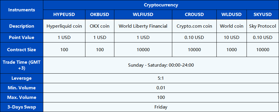 We are pleased to announce that PU Prime will launch new series of Cryptocurrency products – HYPEUSD, OKBUSD, WLFIUSD, CROUSD, WLDUSD and SKYUSD on our MT5 servers starting from 18th October 2025, to provide clients with a broader portfolio of products.