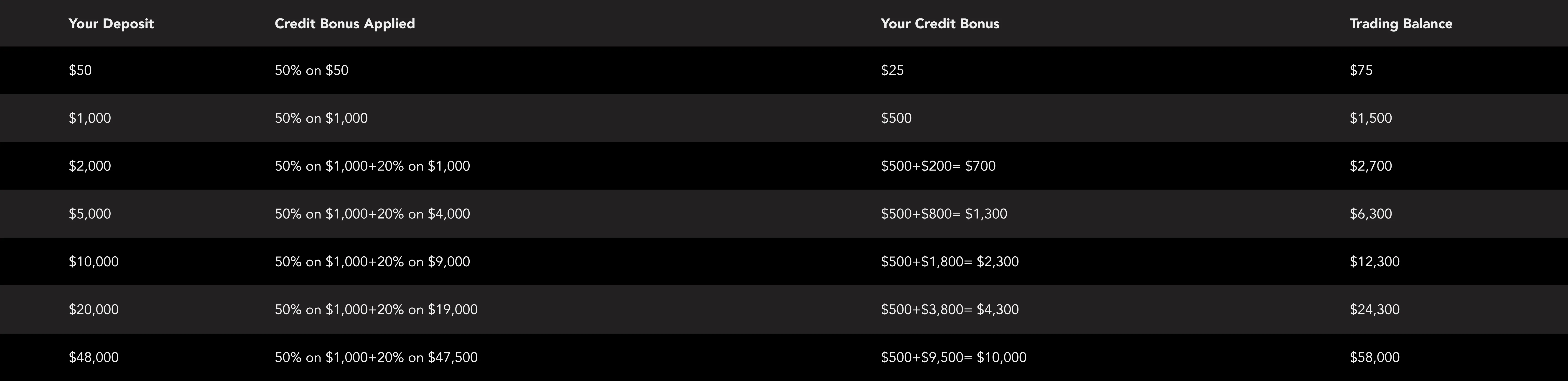 3. If there are multiple trading accounts under the same client’s name, all eligible trading accounts can participate in this promotion, and the system will count the deposit and withdrawal of the account that has received the credit bonus. Based on the client’s ID, clients with the same name account can only redeem a maximum of 10,000 USD in credit (or currency equivalent) in total. (Note: For this promotion, customers can only apply for the “50% Deposit Bonus” once, and all subsequent deposits are only calculated according to the 20% ratio)