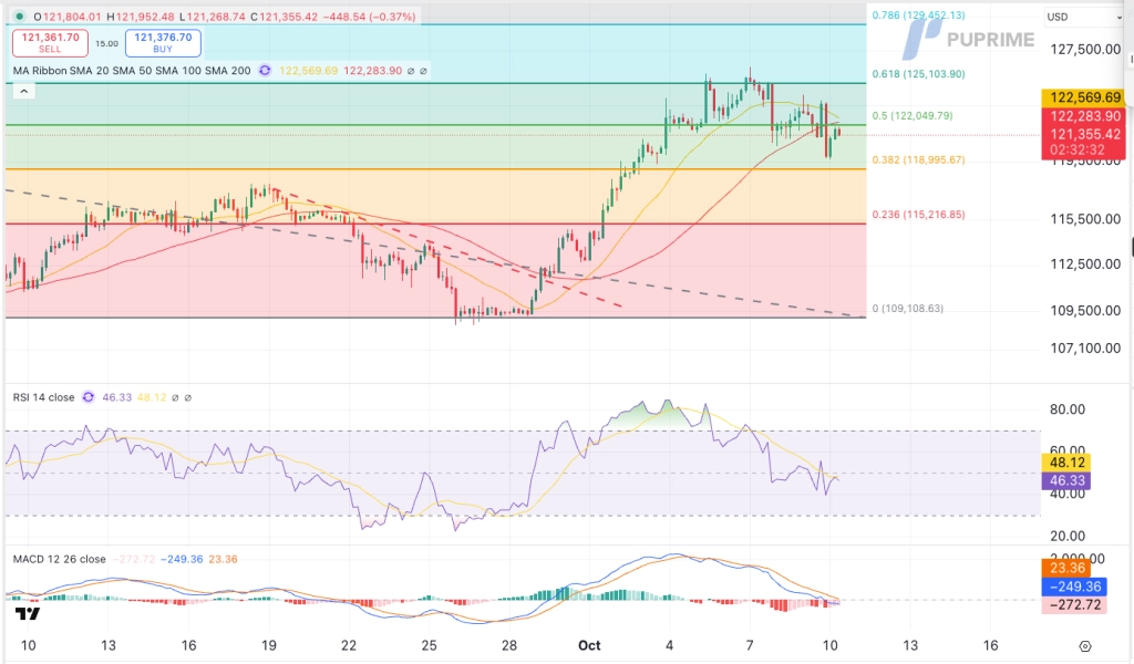 From a technical perspective, the next key support zone lies at $118,995, aligned with the Fibonacci retracement level, followed by deeper support around $115,215. On the upside, resistance levels are seen at $122,050 and $125,105, where fresh selling pressure could emerge.