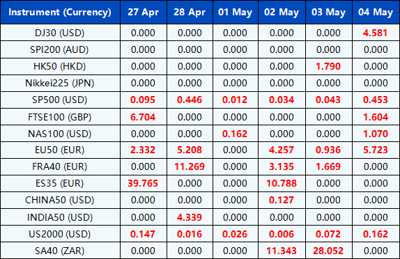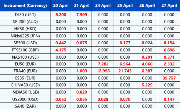 Please be advised that the dividends of the following index CFDs will be adjusted by upcoming ex-dividend dates. The comment for trading index CFDs will be in the following format “Div&<Product Name>&<Net Volume>” which show in the balance after the close of the day before the dividend payment date.