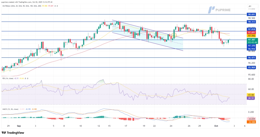 The pair’s inability to maintain support above this level indicates that selling pressure has overwhelmed previous bullish conviction. A sustained trading posture below 97.37 would reinforce the negative outlook and potentially open a path toward the next significant support zone near the 96.20–96.50 area.