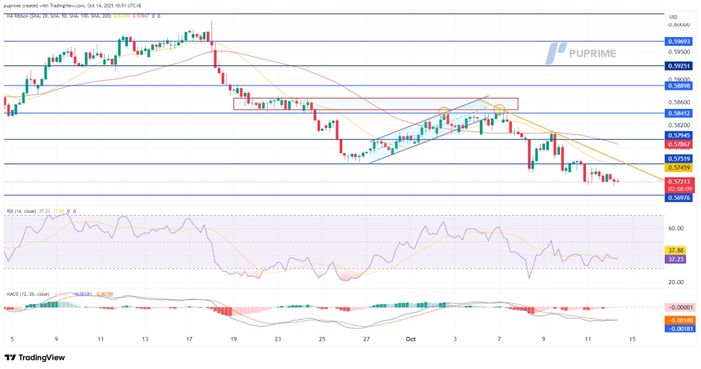 The pair is now testing a significant support level at the 0.5720 mark. A decisive break below this threshold is critical, as it would open a path toward the April low and provide further confirmation of the bearish structural bias.