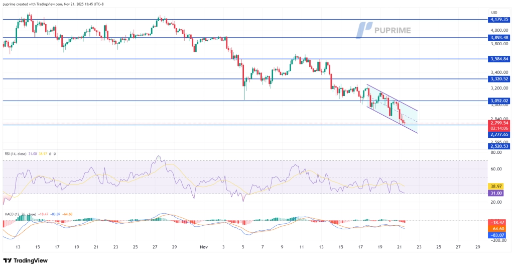 A decisive break below $2,780 would represent a significant technical deterioration, likely triggering accelerated selling momentum and opening a path toward the next substantial support zone near $2,600. This level now serves as the primary demarcation between continued consolidation within the current channel and a potential bearish acceleration.