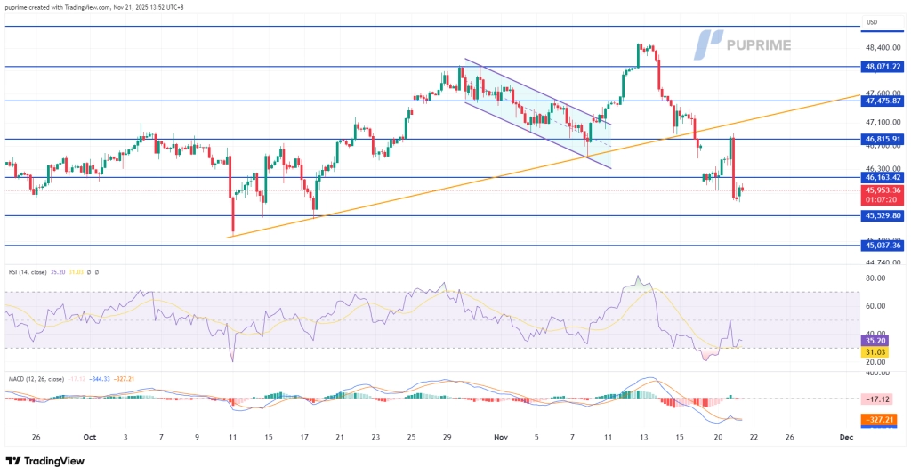 The Dow Jones Industrial Average has sustained a significant technical breakdown, decisively breaching its long-term uptrend support near the 46,900 level. This structural break has triggered a decline of over 2%, effectively erasing all prior recovery gains and establishing a new bearish technical framework.