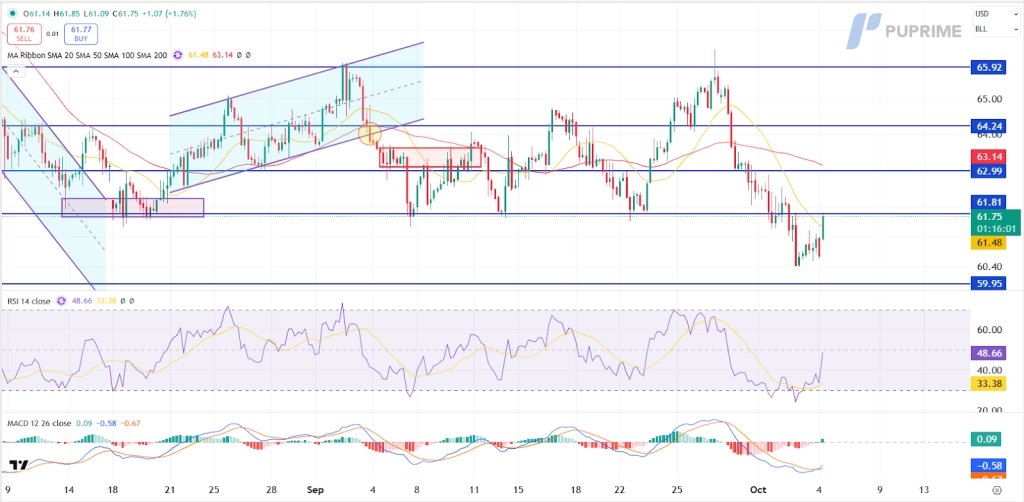 Both MACD and RSI indicate rising bullish momentum, favoring further gains if buyers remain in control. However, failure to sustain above 61.80 could trigger a pullback, with potential declines toward the key support zone at 60.00, and further down to 59.95 – 57.90 if bearish pressure persists.