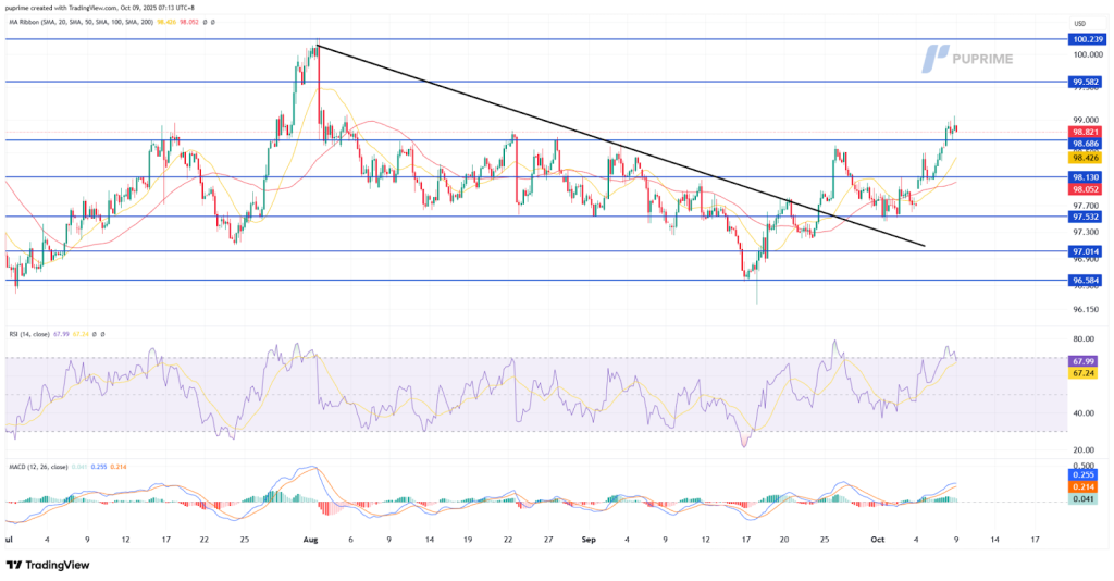 The US Dollar Index (DXY) has continued its upward momentum after breaking above the descending trendline resistance, signaling a shift in market sentiment from consolidation to bullish bias. The index recently tested the 99.00 zone but faced minor resistance near this level, prompting a slight pullback. Despite that, the structure remains constructive as long as price holds above the 98.15 support level, which aligns with the 20-period moving average. Sustained buying pressure could see the dollar retesting the 99.60 resistance, with a breakout potentially opening the path toward the psychological 100.25 level.