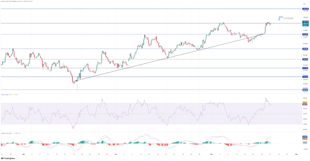 RSI is elevated near 66, showing strong bullish momentum but also signaling that the index is approaching overbought conditions. MACD remains above the signal line with green histogram bars, confirming ongoing strength, though the histogram is starting to flatten, suggesting the move may be slowing.Overall, the trend remains bullish above the rising trendline, but upside progress is becoming more constrained as price nears a major resistance area.