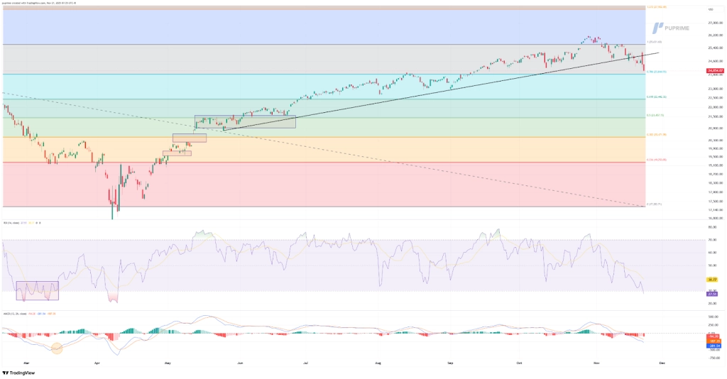 Momentum indicators reinforce the current downward pressure. RSI is falling toward the oversold region, signaling consistent selling strength without signs of a reversal yet. Meanwhile, the MACD remains below the signal line with expanding negative histogram bars, confirming bearish momentum and a lack of bullish participation.
