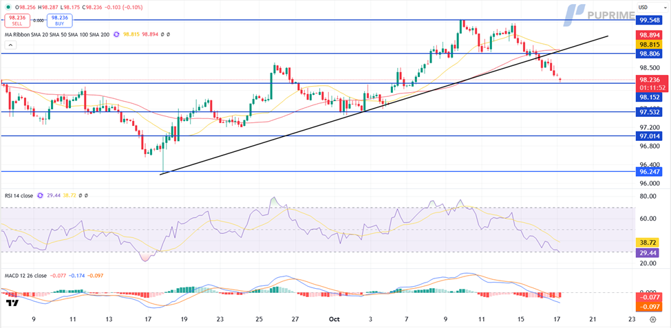 If bearish momentum persists, the next downside target lies near 97.55. However, the MACD indicates weakening downside pressure, and the RSI at 29 suggests the index has entered oversold territory, raising the probability of a short-term rebound toward 98.80.
