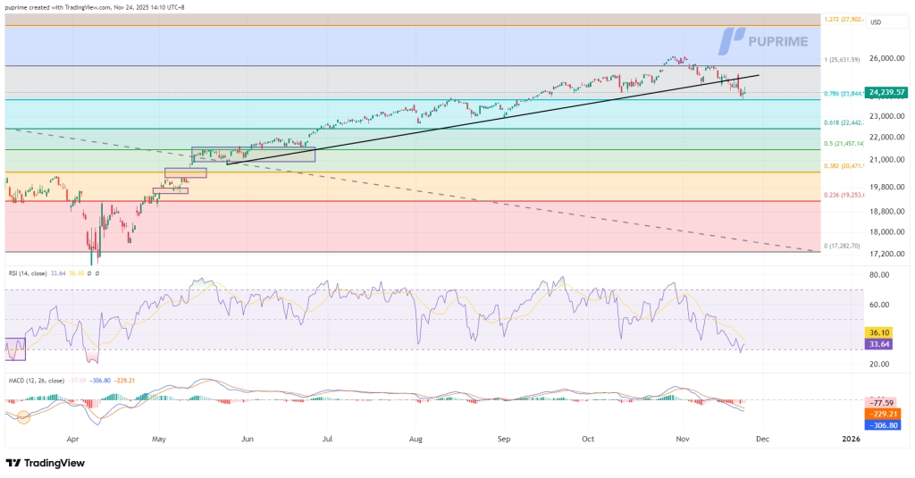 RSI is hovering around the mid-30s after a persistent decline, reflecting strong selling pressure while still not deeply oversold. MACD remains bearish with widening negative histogram bars, showing momentum is still favoring the downside. Unless buyers step in at the 0.618 zone, the index risks extending the correction further.