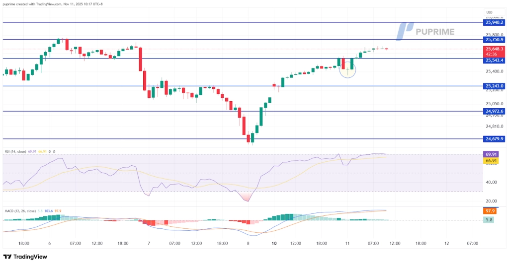 The index now faces a critical technical test at the 25,540 support level. A sustained hold above this threshold would confirm the resilience of the current upward momentum and support the case for continued strength within the prevailing bullish trajectory.