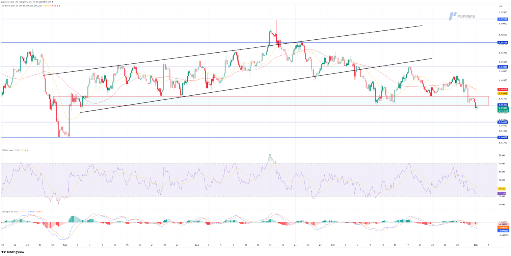 EUR/USD has broken below its ascending channel pattern on the chart, confirming a shift from a medium-term bullish structure to a bearish bias. The pair is currently consolidating around the 1.1540 support area, which aligns with previous price congestion seen in early August. The breakdown below 1.1590 marked a key structural failure, suggesting sellers are regaining control.