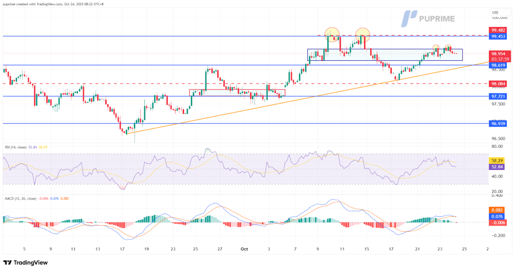 The convergence of the double-top reversal pattern at a key resistance level and the waning bullish momentum paints a compelling bearish picture. A confirmed break below the recent swing low would validate this outlook and likely trigger a move toward lower support levels. The index’s ability to hold above the 99.15 mark remains the critical test for the bulls.