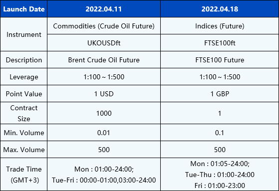 We are pleased to announce the addition of the following IFEU futures to provide clients with a broader portfolio of products, Brent Crude Oil Futures (UKOUSDft) and Financial Times Stock Exchange 100 Index Futures (FTSE 100ft).