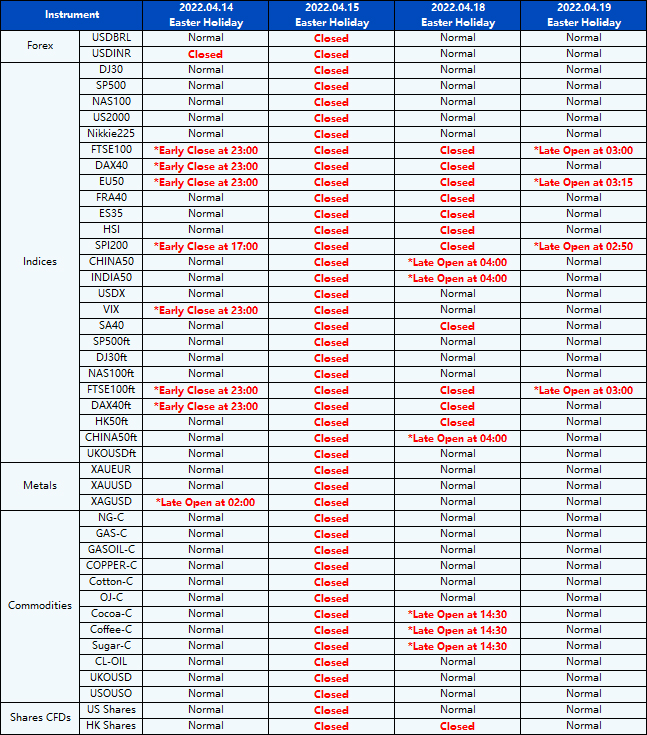 Please be advised that the following instruments’ trading hours and market session times will be affected by the upcoming Easter Holidays.