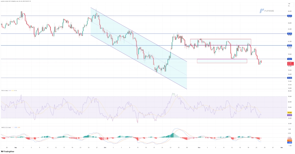 USOIL continues to trade near the lower boundary of its consolidation range, with price holding just below the key 58.30 support level. After breaking out of the descending channel earlier in the month, the market has settled into a broad sideways structure, oscillating between 58.30 resistance and 57.00 support. This horizontal range reflects a period of compressed momentum as neither buyers nor sellers have been able to establish firm control, keeping the market in a neutral but vulnerable position.