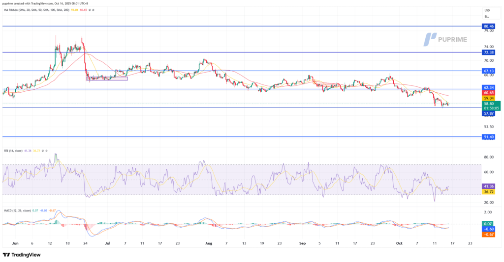 Overall, the technical bias remains bearish unless oil can hold above $60.00 with follow-through buying. Failing that, momentum indicators point to further downside risk toward $57.90, in line with a broader risk-off tone across commodities.