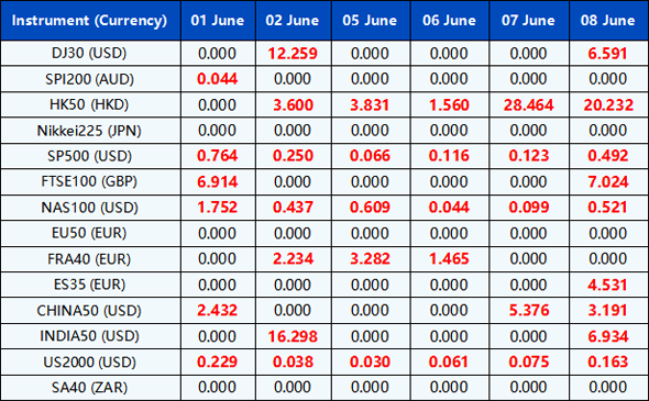 Please be advised that the dividends of the following index CFDs will be adjusted by upcoming ex-dividend dates. The comment for trading index CFDs will be in the following format “Div&<Product Name>&<Net Volume>” which show in the balance after the close of the day before the dividend payment date.