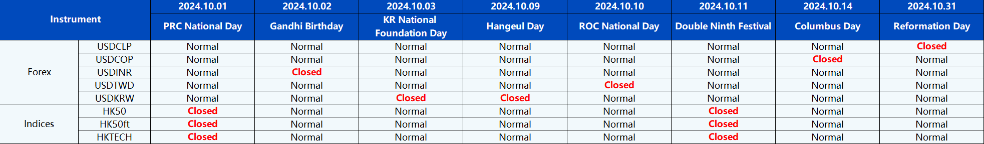 Please be advised that the following instruments’ trading hours and market session times will be affected by the upcoming October holidays.