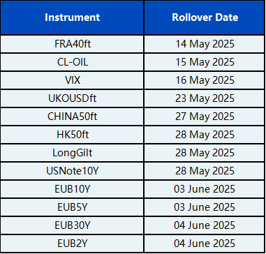 Please be advised that the following CFD instruments will be automatically rolled over as per the dates in the table below. As there can be a pricing difference between old and new futures contracts, we recommend clients to monitor their positions closely and manage positions accordingly.