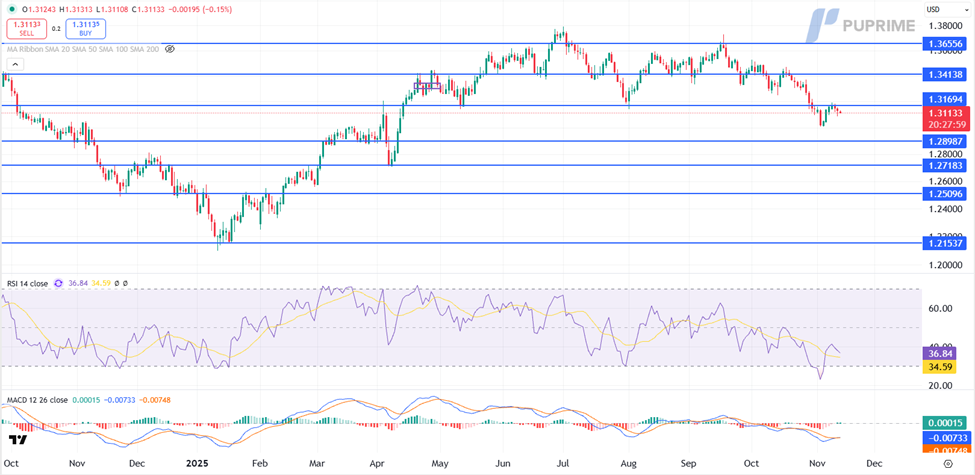 If the downtrend extends, the pair could retest the next support level at 1.2900. Conversely, a rebound above 1.3170 would suggest a potential shift toward consolidation or recovery.