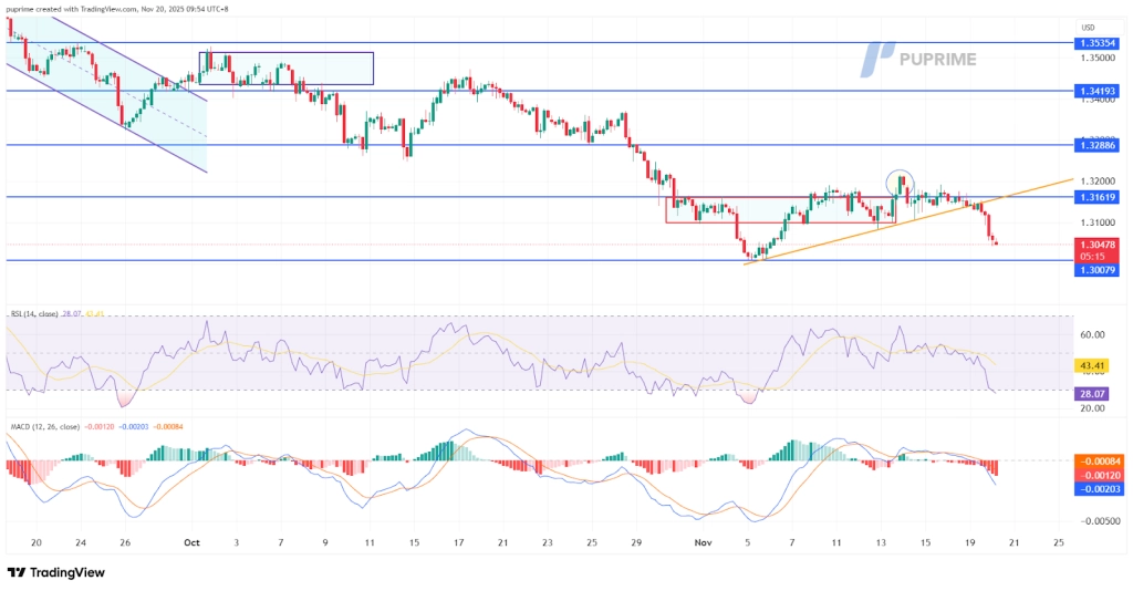 The GBPUSD pair has confirmed a significant deterioration in its technical structure, declining approximately 5% from its September peak of 1.3725. The breakdown follows a period of consolidation that culminated in a false breakout pattern—a classic bearish continuation signal—before the pair decisively broke below its established range support.