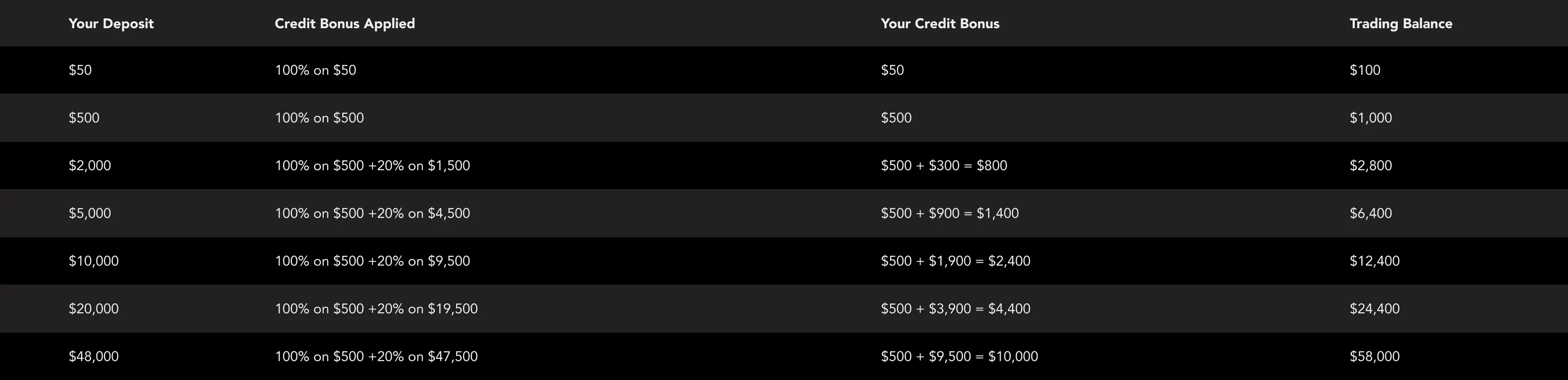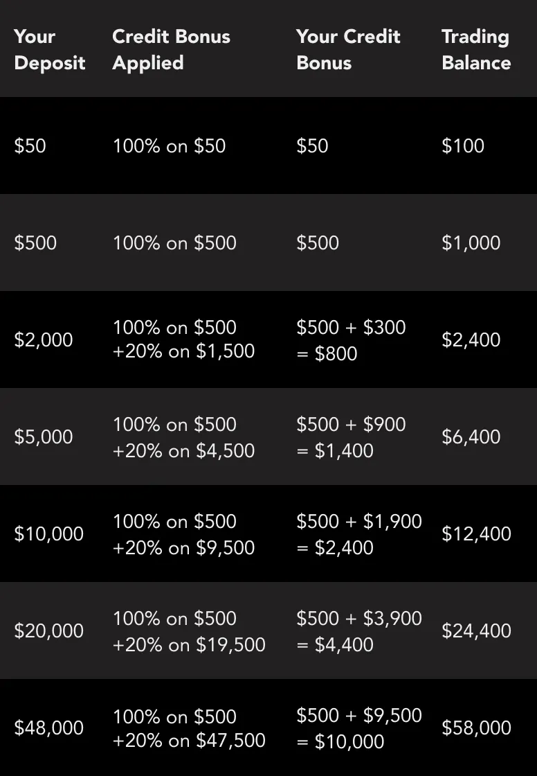 • f.This promotion is valid for a limited time only, please refer to the promotion page in the client portal or APP for the specific period. Only new deposits made within this validity period will be counted towards the calculation of the credit bonus (es) credited to the client's account.