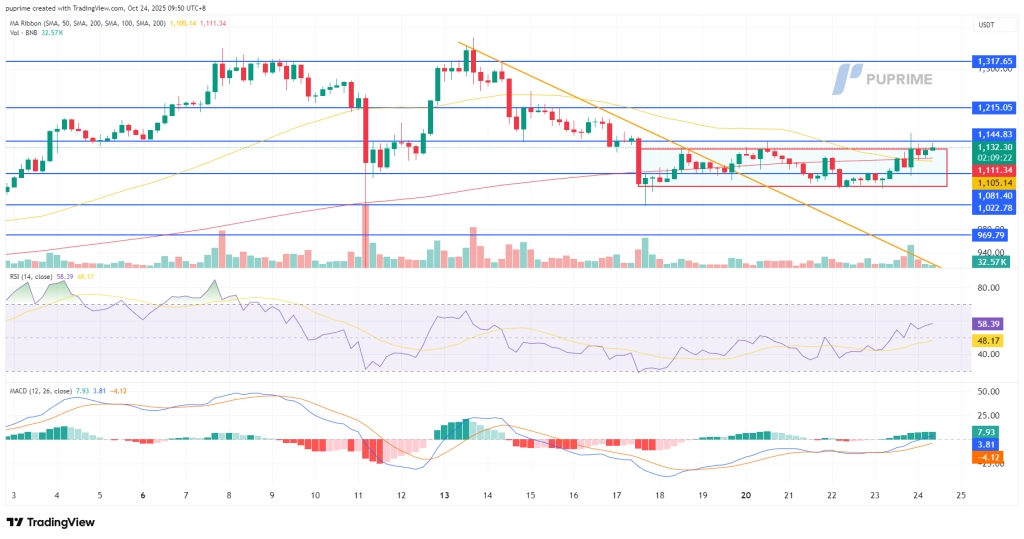 BNB is exhibiting signs of a decisive bullish move following a prolonged period of consolidation, having been range-bound between the $1,056 and $1,132 levels for the past week. The cryptocurrency’s gain of over 5% in the last session now positions it for a potential breakout above this key resistance zone.