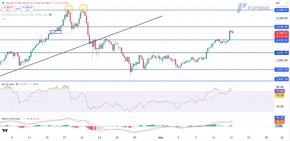 However, the MACD shows signs of diminishing bullish momentum, while the RSI at 71 signals overbought conditions — indicating the possibility of a technical correction toward 4,135.00 before the next leg higher.