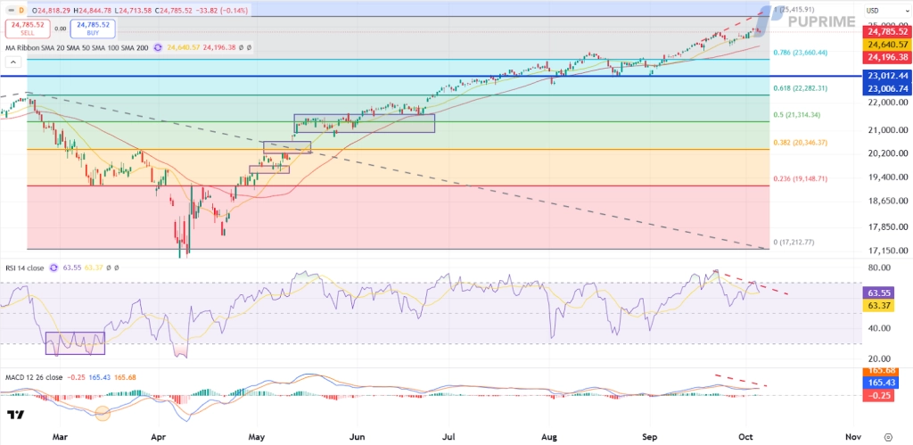 However, warning signs are emerging. The MACD is showing diminishing bullish momentum, while the RSI has retreated from overbought levels, signaling a possible bearish divergence. This suggests rising risks of a near-term pullback. Should the index fail to maintain its gains, a retracement toward 23,660.00 is likely, with 24,195.00 acting as an intermediate support.
