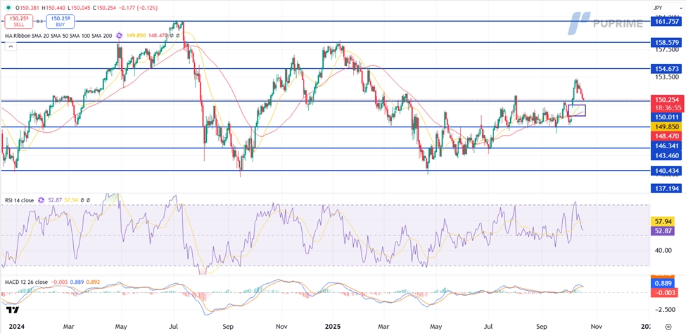 USD/JPY trades lower, testing key support at 150.00, with MACD showing diminishing bullish momentum and a potential bearish crossover. RSI has retreated sharply from overbought territory, signaling possible short-term correction.