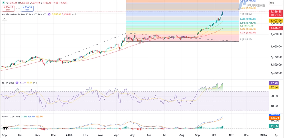 Gold continues to hover near record territory, testing the Fibonacci expansion level (1.272) at 4,390.00. MACD signals strong bullish momentum, though a Doji candlestick on the daily chart suggests potential hesitation.