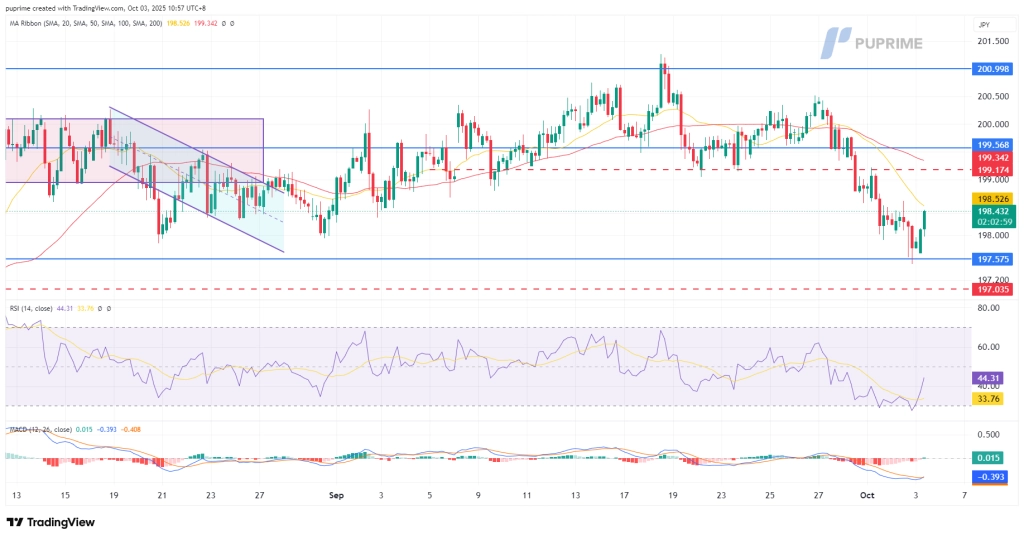The pair now faces a substantial resistance zone between 199.00 and 199.30—the former support area that is now expected to act as a barrier to further recovery. A rejection at this level would reinforce the bearish bias and likely trigger a resumption of the downward move, potentially targeting the next support level near 196.50.